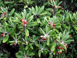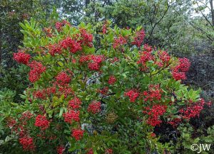 Toyon![]()  | •Produces bright red berries in winter, a key food source for birds and mammals •Provides dense cover and nesting habitat •Supports native pollinators with its summer flowers •One of the few fruit-bearing shrubs in chaparral during cold months  |