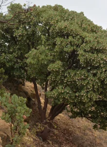 Manzanita   | •Offers nectar early in the season for hummingbirds and native bees •Fruits are eaten by birds, foxes, and coyotes, aiding seed dispersal •Gnarled branches and dense leaves create shelter for small mammals and birds •Deep roots help stabilize slopes and store water  |